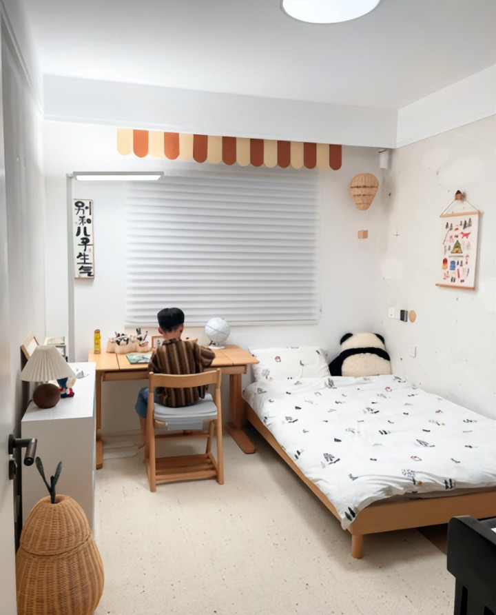 儿童房的核心不是收纳,中间留出一块空地,孩子可以玩玩具、看书、做运动。家具尽量选成品,比如1.2米的小床,搭配能调节高度的书桌,孩子从小用到大,实用又环保。