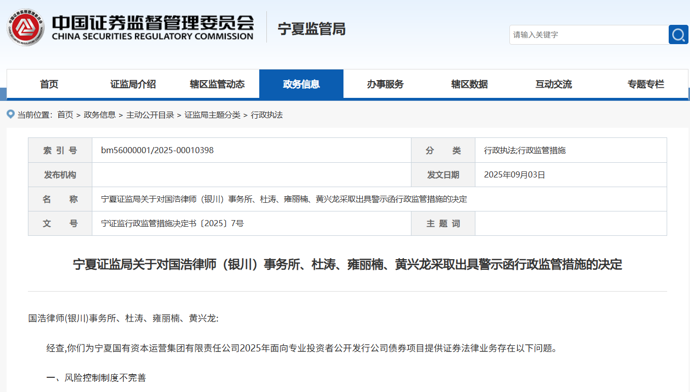 【大河财立方消息】9月3日,宁夏证监局披露的行政监管措施显示,国浩律师(银川)事务所因在公司债券项目中提供证券法律服务违规,收到监管警示函。