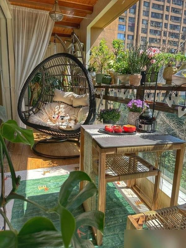 10平米的地方,阿姨用长条木板把墙和顶裹了一圈,才花千把块,瞬间把冷冰冰的水泥壳子变成了暖乎乎的“木头小房子”,站进去都能闻着木头的清香气,比装那些花里胡哨的吊顶舒服多了。中间摆个矮矮的木茶几,右边做了能坐三个人的长柜沙发,左边挂个懒人鸟巢篮,茶凉了蜷进篮里晒会儿太阳,书看累了抬眼就是满墙的龟背竹、虎皮兰,叶子舒展开跟小扇子似的,连空气里都飘着铜钱草的清润劲儿——这哪是阳台?分明是藏在高楼里的“空中小森林”,比商场里的网红咖啡馆还让人想多待一会儿。